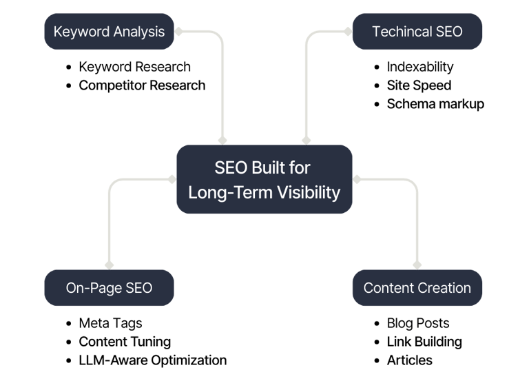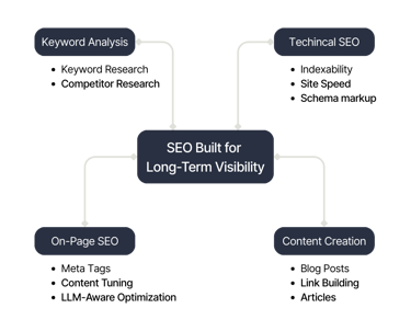 We optimize your entire search ecosystem from technical, content, and answer-level signals so you get stronger visibility and conversion over time.