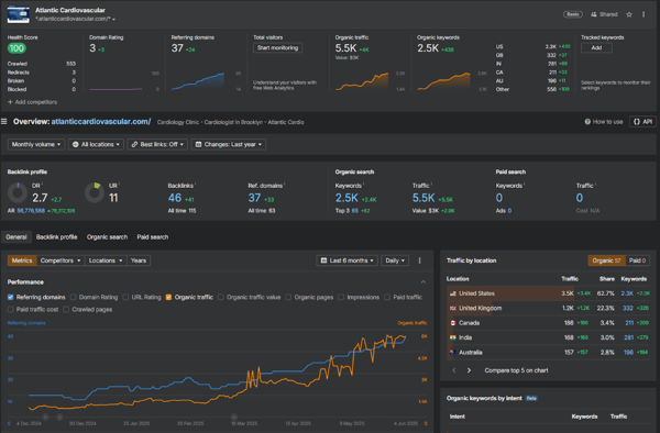 This strategy led to Atlantic Cardiovascular achieving #1 rankings for multiple key terms, such as “how fast does blood travel in your body” and “how long does blood take to circulate.” These rankings significantly increased organic visibility and drove a steady stream of qualified traffic to the website, establishing Atlantic Cardiovascular as an authoritative source for cardiovascular information online.