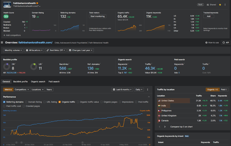 Through this strategy, Faith Behavioral Health secured page-one rankings for multiple high-value keywords, including reaching the #1 position for “delayed emotional response.” These rankings significantly boosted organic traffic and positioned the brand as a trusted authority in mental health resources, leading to measurable growth in site engagement and leads.